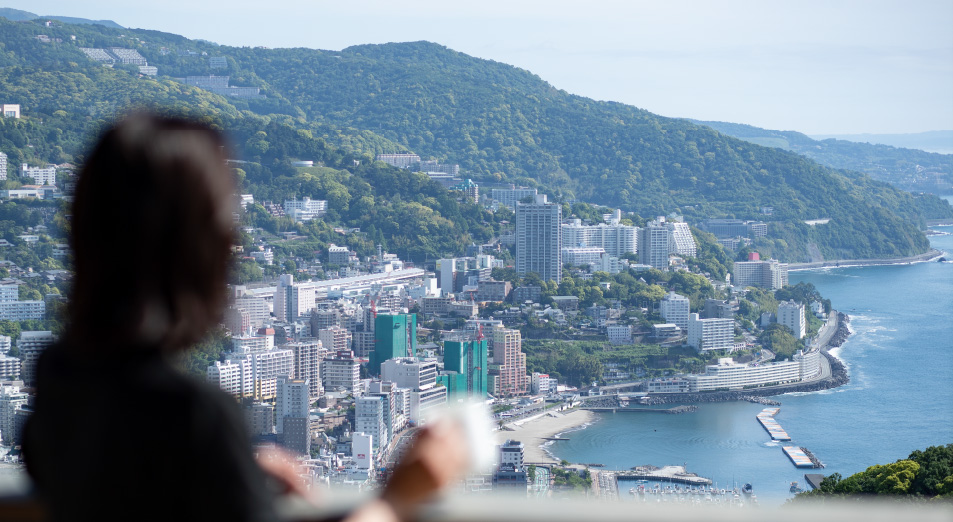 熱海の海街が望める開放的な空間で、